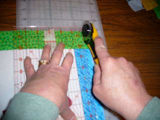 CH threaded the sewing machine with clear thread on top, and blue thread on the bottom (in the bobbin). She then stitched "in the ditch" between the trim fabric and an actual T-shirt section. The clear thread (rather than blue) was used on top so it wouldn't be so obvious if it slipped out of the "ditch." Since the T-shirts (and their printing) are in so many colors, the clear thread was the best easy match for them all. After going all the way around the edge of a T-shirt section, the triangles on the T-shirt section were sewn.